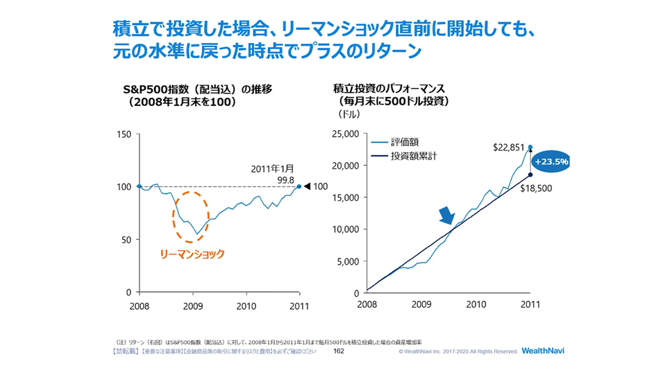 リーマンショックの直前に積立投資を開始した場合、相場が元の水準に戻った時点でプラスのリターンになっていることが分かります。これは、金融危機などで相場が下がり、その後回復していく時、一括投資だと資産が減った後で元に戻るだけですが、積立投資の場合は株価が下がったタイミングで安く買い増しができるため、相場が元の水準に戻っただけでもプラスのリターンが出るのです。