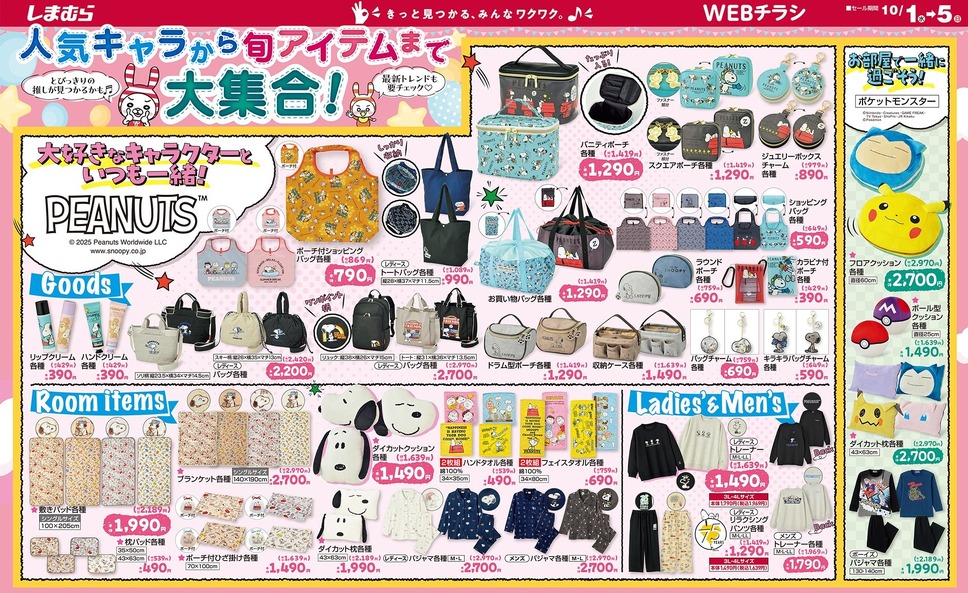 スヌーピーやポケモンなど人気キャラクターアイテムが勢ぞろい。「ポーチ付ショッピングバッグ」はコンパクトに収納でき、エコバッグとして使える便利な商品。さらにはリップやハンドクリーム、ブランケットなど、これからの季節に欠かせないアイテムが多数登場しています。