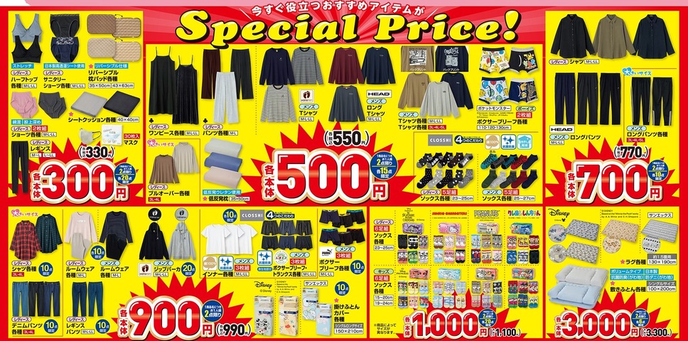 「リバーシブル枕パッド」は330円という驚きの激安価格。気軽に洗えて、季節や気分で使い分けできるのが嬉しいポイントです。また、550円の「メンズロングTシャツ」は日常に取り入れやすいシンプルなデザインで、ちょっとそこまでコーデやルームウェアとしてもおすすめのアイテムです。