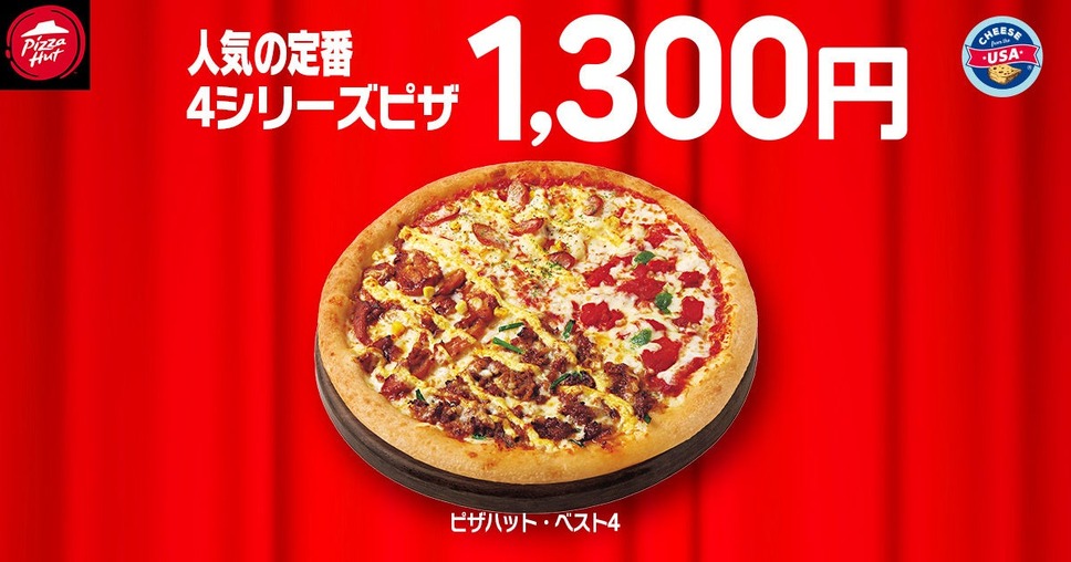 さらに、4つの人気フレーバーが集まったMサイズの「ピザハット・ベスト4」は、通常価格3,190円から1,890円引きの1,300円となります。