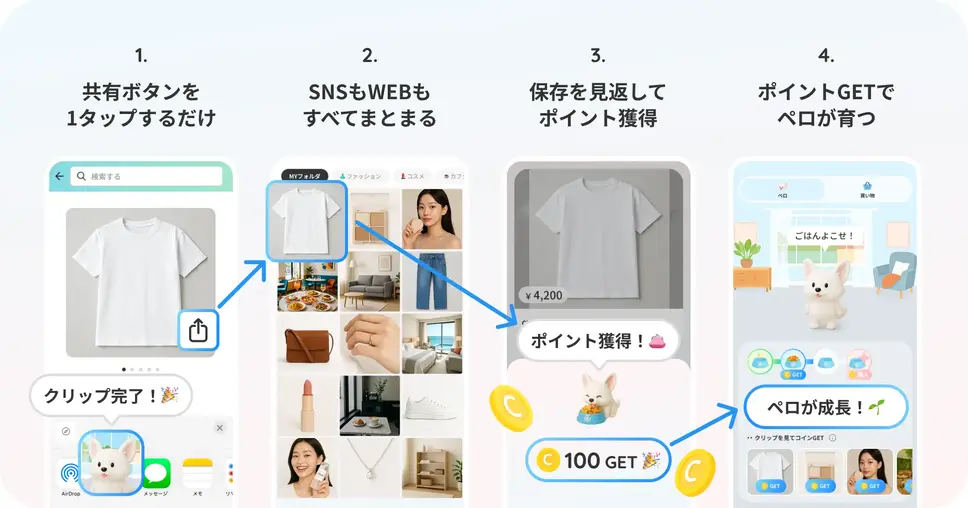 また、アプリにはマスコットキャラクター「ペロ」が登場し、ポイントを獲得するたびにレベルアップしていく育成ゲーム要素も搭載されています。日々の情報整理を楽しみながら行えるよう工夫されています。さらに、保存した商品の最安値サイトやキャッシュバックサイトを自動で発見するお得な機能も備えており、ユーザーの購買活動をサポートします。