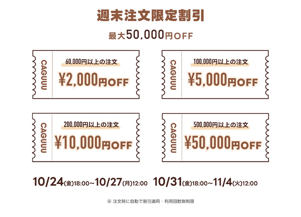 10月24日(金)18時~10月27日(月)12時、10月31日(金)18時~11月4日(火)12時の期間中、購入金額に応じた自動割引が適用されます。割引内容は6万円以上で2,000円OFF、10万円以上で5,000円OFF、20万円以上で10,000円OFF、50万円以上で50,000円OFFです。