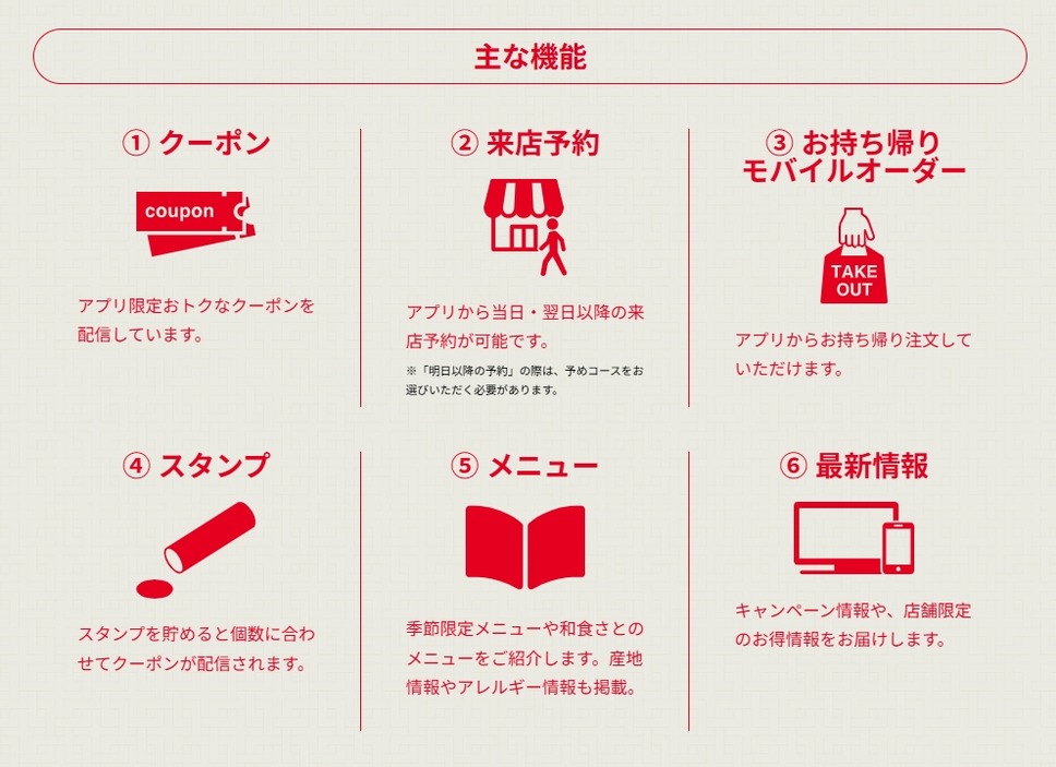「さとアプリ」は、クーポンの配信だけでなく、来店ごとにポイントが貯まるスタンプ機能や、アプリ内での来店予約、持ち帰り注文など、利便性の高い機能を多数搭載しています。