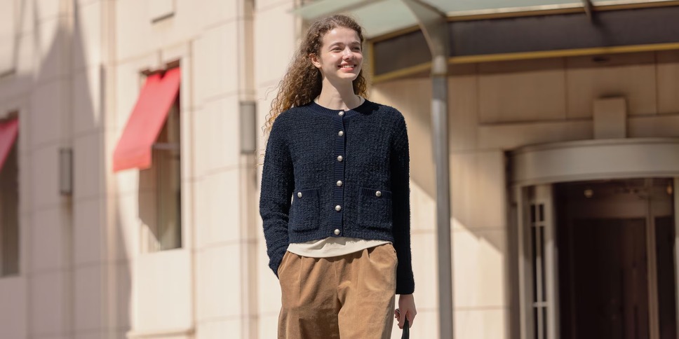 トレンドのツイード調素材を使ったニットカーディガン。ざっくりとした編み地ながら上品に見え、Tシャツに羽織るだけでも大人っぽく仕上がります。軽いのにしっかり暖かく、室内外の温度差がある季節にも便利な1枚です。