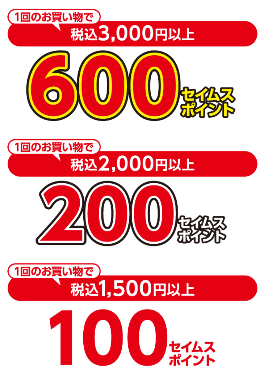 進呈されるセイムスポイントには上限が設けられています。1回のお買い物につき最大600ポイント、そしてキャンペーン期間中を通じて1人あたり最大1,800ポイントが上限です。