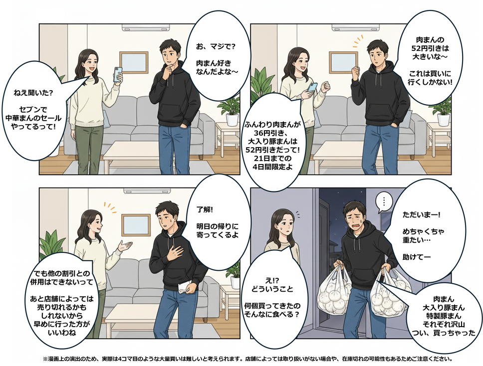漫画にもあったように、できたての温かい中華まんをお得に楽しめる企画となっています。値引きはセブン‐イレブン標準価格(税抜)からとなり、他の値引きキャンペーンとの併用はできません。