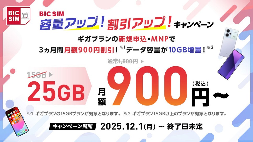 ビックカメラグループが提供するMVNOサービス「BIC SIM powered by IIJ」(以下、BIC SIM)は、2025年12月1日(月)より、複数の新たなキャンペーンを開始します。