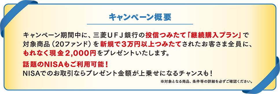 三菱UFJ銀行は、投信つみたて(継続購入プラン)の新規契約を対象に、現金2,000円を付与するキャンペーンを2025年12月1日(月)から2026年2月27日(金)まで実施します。