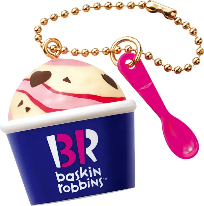 カップ型キーホルダー: ラブポーションサーティワンとピンクのスプーン。サイズは約3.3cm×約3.2cmです(チェーン除く)。