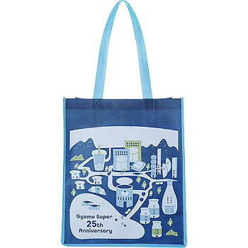 業務スーパー25周年を記念して誕生したオリジナルエコバッグ。爽やかなブルーを基調に、人気商品のモチーフを散りばめた遊び心のあるデザインが魅力です。