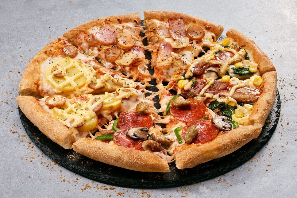 1枚で4種の味が楽しめる「クワトロ・ピザ」は1997年に開発された商品で、「炭火焼チキテリ」「ドミノ・デラックス」「マヨじゃが」「ガーリック・マスター」などの人気の味を一度に楽しめます。価格はデリバリーがS 2,980円/M 3,680円/L 4,580円、お持ち帰り半額がS 1,490円/M 1,840円/L 2,290円です(いずれも税込)。