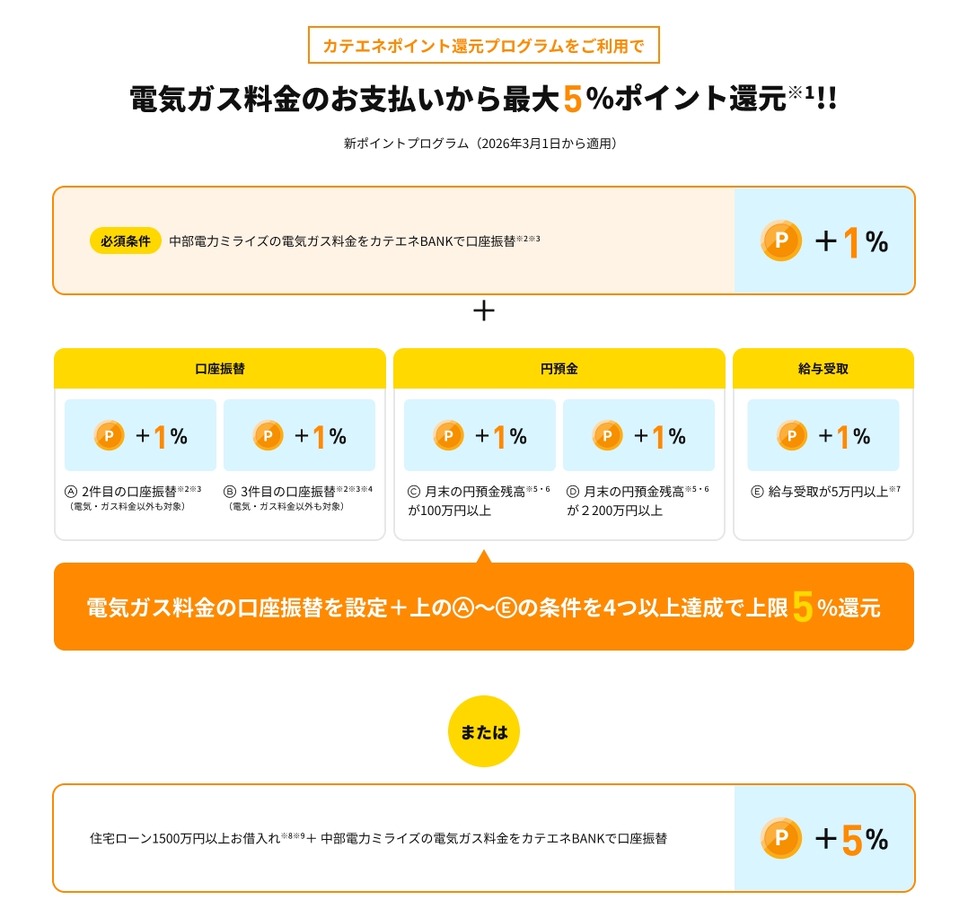 2026年3月1日(日)から、カテエネBANKでは銀行サービスの利用状況に応じて、毎月、中部電力ミライズの電気・ガス料金の支払い額の最大5%がカテエネポイントで還元されます。このたび、新たに預金と給与受取の条件を追加しました。