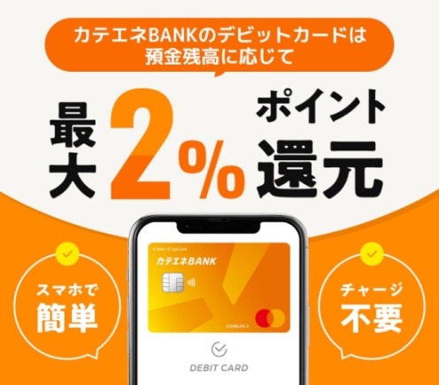 2026年1月1日(木)から、デビットカードの利用額に対して最大2%のカテエネポイントを進呈します。還元率は、デビットカード利用の前月末における円預金残高により決定します。