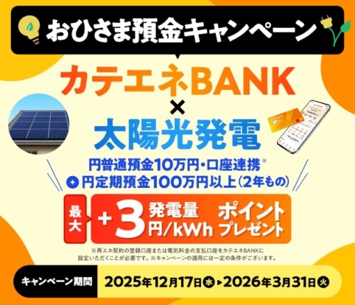 太陽光発電を利用の顧客向けに「おひさま預金キャンペーン」を実施します。申込期間は2025年12月17日(水)から2026年3月31日(火)まで、特典対象期間は2026年4月検針分から2028年3月検針分(最大2年間)です。
