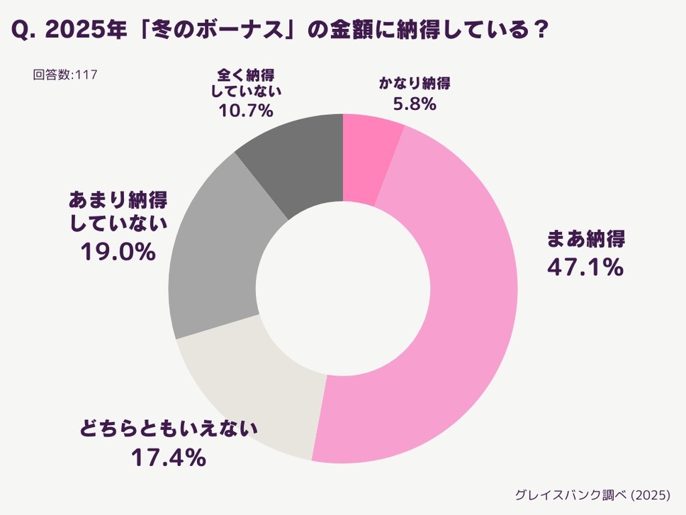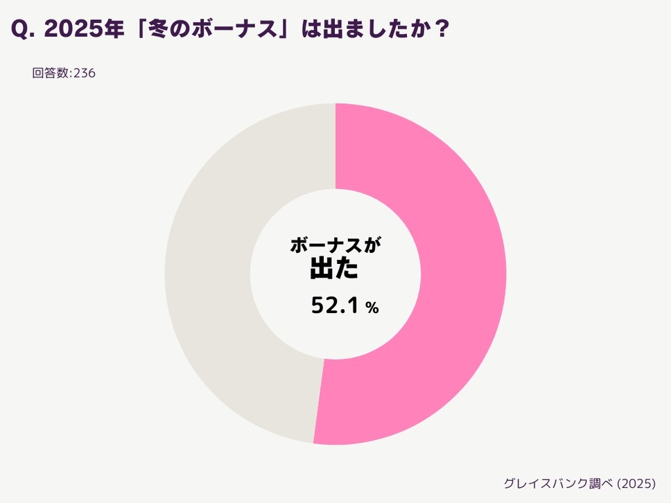 有職者236名のうち、今年の冬のボーナスが「出た」と回答したのは52.1%で半数を上回りました。受給者の金額分布では「~50万円未満」が合計66.7%を占め、「150~200万円未満」「200万円以上」は該当者なしでした。金額への納得度は、「かなり納得している」「まあ納得している」の合計が52.9%。一方で「あまり納得していない」「全く納得していない」は約3割となり、評価は二分しています。