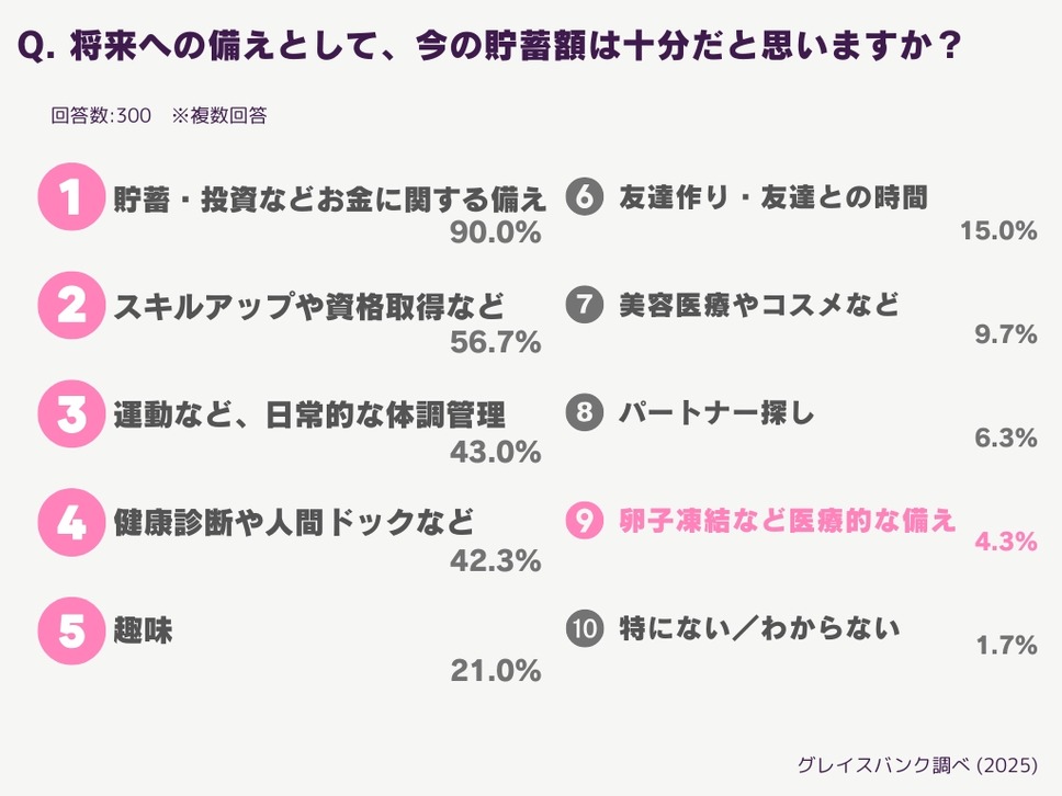 将来の備えは「お金」「スキル」「健康」、卵子凍結は4.3%