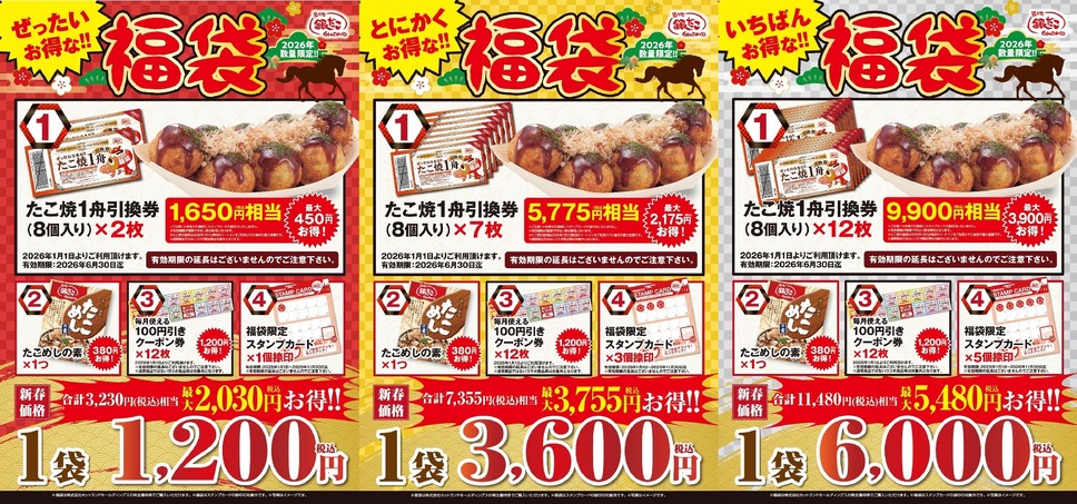 内容:たこ焼1舟引換券(8個入り)12枚、銀だこ特製「たこめしの素」、毎月使える「100円引き(税込価格より)クーポン券」、福袋限定「銀だこスタンプカード スタンプ5個捺印」