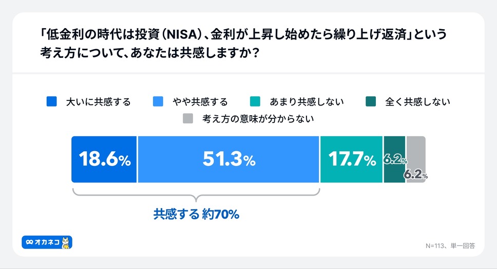 「低金利期は投資、金利上昇時は繰り上げ返済」という定説に「大いに共感」18.6%、「やや共感」51.3%で計約70%が賛同しました。