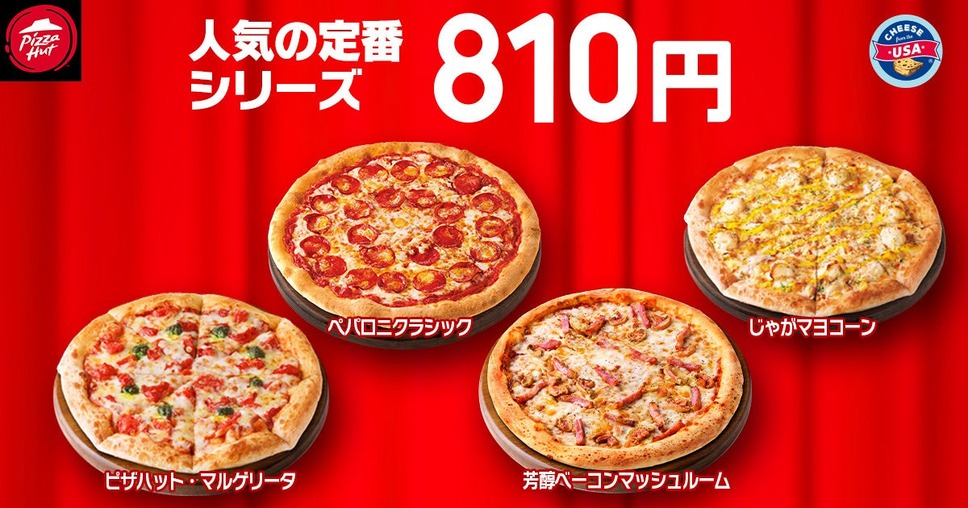 期間は3日間で、全国のピザハット店舗(一部を除く)で実施。1月は、810円のピザが4種類、1,100円のピザが5種類、1,300円のピザが1種類、サイドメニューが2種類のラインナップです。さらに一部店舗ではSサイズピザが600円で販売されます。