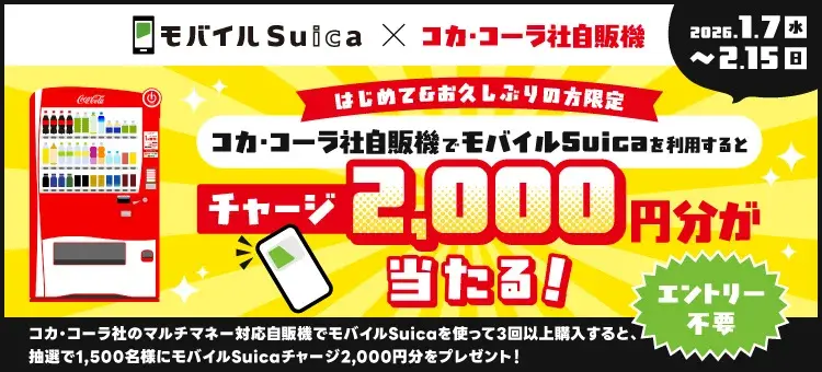 エントリー不要で、初めて利用する方や久しぶりに利用する方を対象に実施されます。期間中にコカ・コーラ社のマルチマネー対応自販機で合計3回以上購入すると、抽選で1,500名に「モバイルSuicaチャージ2,000円分」が当たります。