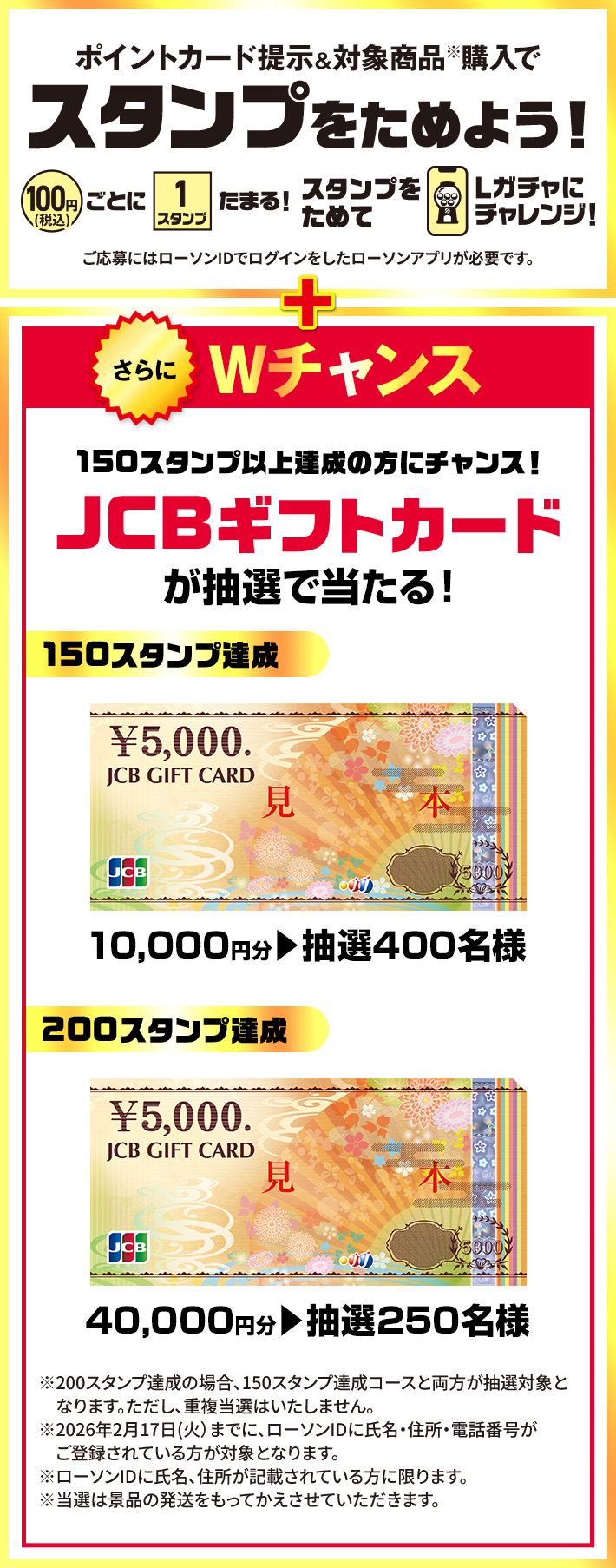 150スタンプ達成で10,000円分を抽選400名、200スタンプ達成で40,000円分を抽選250名が対象です。