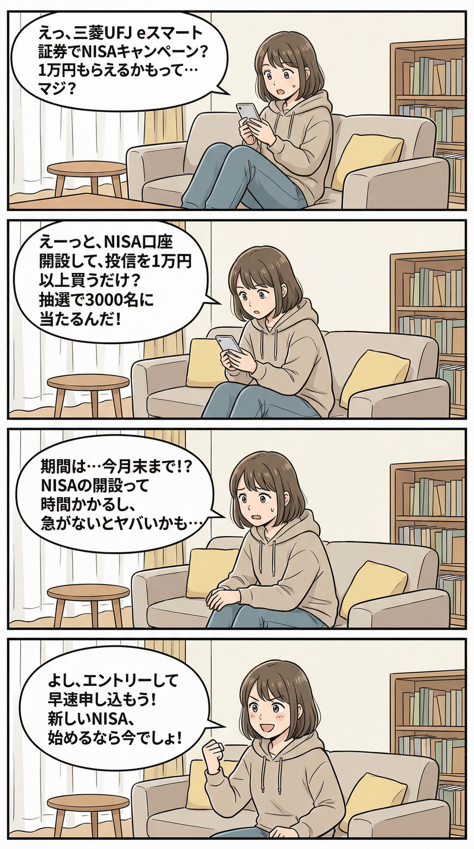 これからNISAを始めたい方や、他社からの乗り換えを検討している方にとっても見逃せないキャンペーンなので、まずは編集部オリジナルの4コマ漫画をご覧ください。