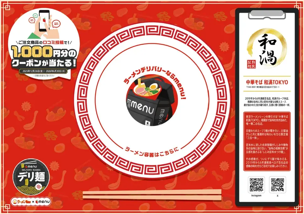 デリバリーアプリ「menu」では、「デリ麺プロジェクト」参加店を対象に、口コミ投稿者を毎月抽選で各店舗5名選出し、menuクーポン1,000円分を進呈するキャンペーンを2025年12月26日(金)から2026年6月30日(火)23時59分まで実施しています。