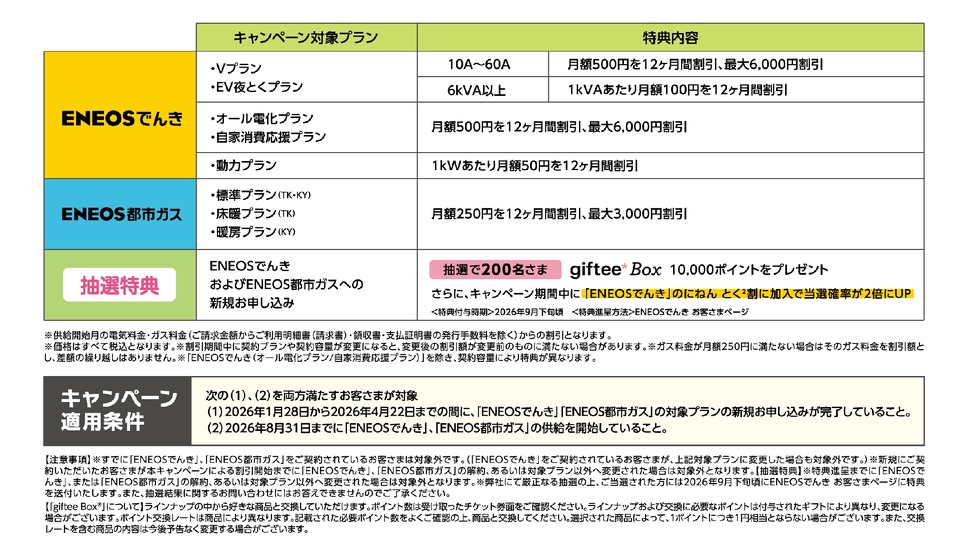両サービス(「ENEOSでんき」と「ENEOS都市ガス」)を新規で申し込むと、抽選で200名にデジタルギフト「giftee Box」10,000ポイントが進呈されます。