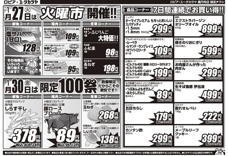 1月28日(水)から2月2日(月)までの期間中は、日替わりの目玉特売に加え、金曜日限定で「限定100祭」も開催予定です。