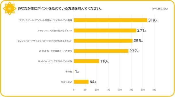 貯め方では「アプリやゲーム、アンケート」が319人(25.4%)で最も多く、「キャッシュレス決済で貯まるポイント」が271人(21.6%)と続きました。