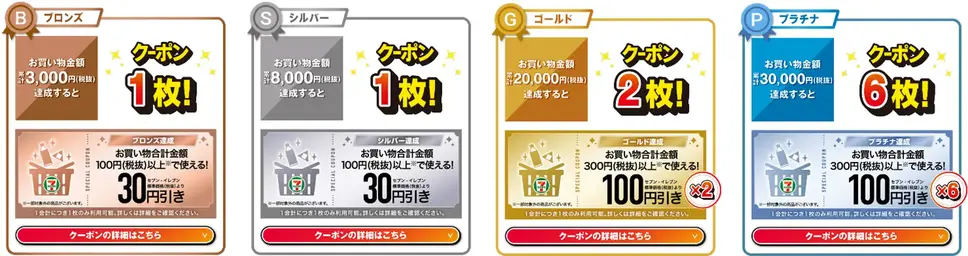 期間中、店頭での会計時にセブン‐イレブンアプリの会員コードを提示すると、累計お買い物金額(税抜)に応じてランクが昇格し、達成ごとにクーポンが配信されます。