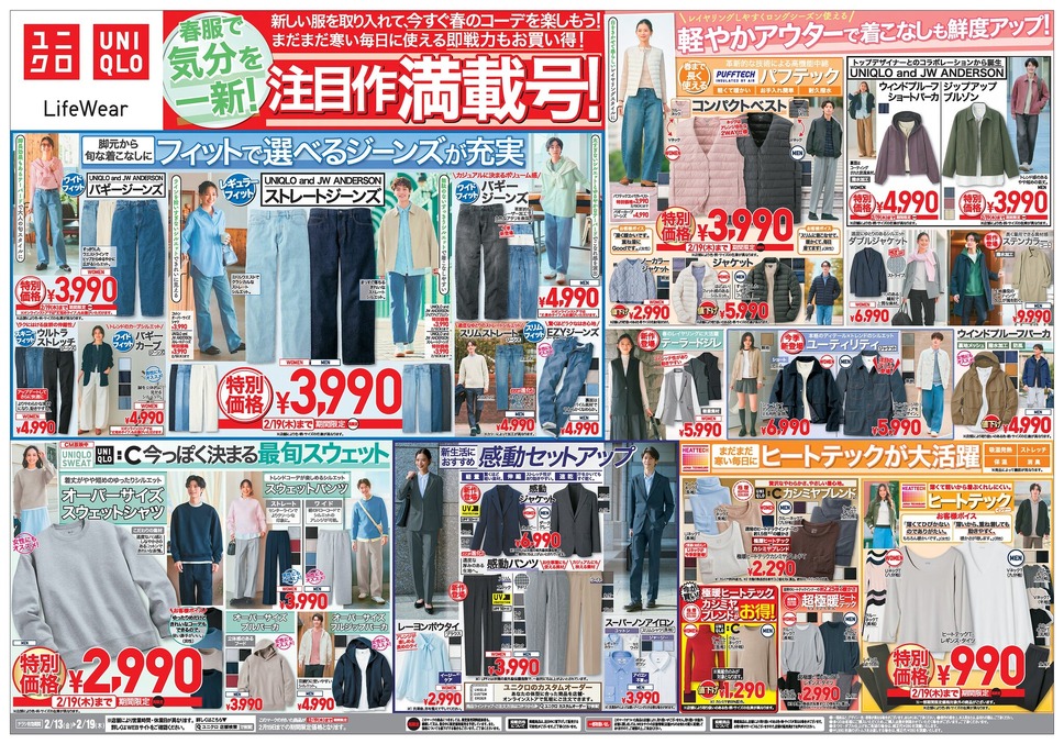 気温差が大きいこの時期は、「今すぐ着られる春服」と「まだ必要なあったかアイテム」の両立がポイント。今週のユニクロでは、人気コラボジーンズや春向けスウェット、さらにヒートテックまで幅広いアイテムが特別価格で登場しています。