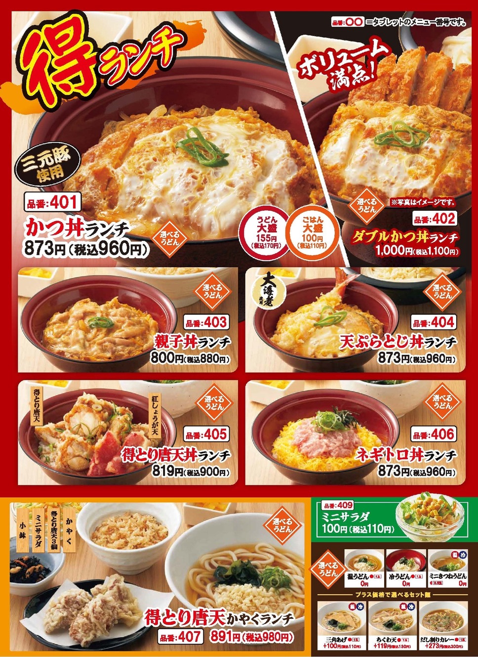 得得のランチメニューは、かつ丼ランチ 税込960円、親子丼ランチ 税込880円、天ぷらとじ丼ランチ 税込960円、得とり唐天丼ランチ 税込900円、ネギトロ丼ランチ 税込950円、得とり唐天かやくランチ 税込980円を用意します。