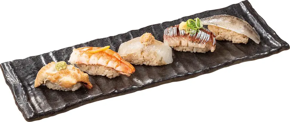 とろける煮穴子、柚子香る、餡かけ海老握り、平目の昆布〆握り あん肝ポン酢のせ、とろにしんの鞍掛握り、飲める炙りメヒカリの5貫を一皿で提供します。
