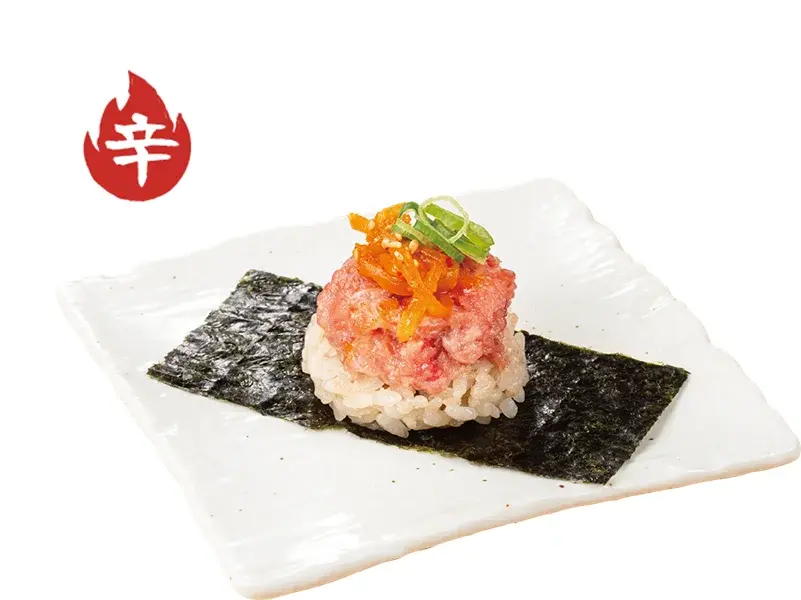 店内でたたいた中とろ・まぐろ・ねぎまぐろに、ポリポリ食感のたくあんとピリ辛のチャンジャダレを合わせます。