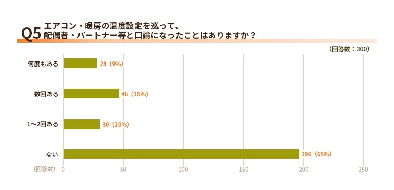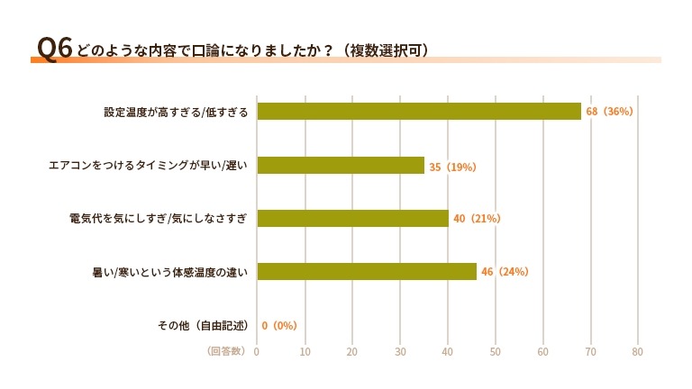 口論の主因は「設定温度が高すぎる/低すぎる」「体感温度の違い」「電気代を気にしすぎ/気にしなさすぎ」「つけるタイミングが早い/遅い」の順で並びました。