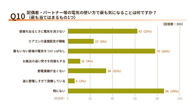 気になる行動は「特にない」29%の一方、「誰もいない部屋の電気をつけっぱなし」26%、「部屋を出るときに電気を消さない」21%、「エアコンの温度設定が極端」8%、「お風呂の追い焚きを何度もする」4%、「節電意識が全くない」11%、「節電しすぎて我慢」2%が挙がりました。