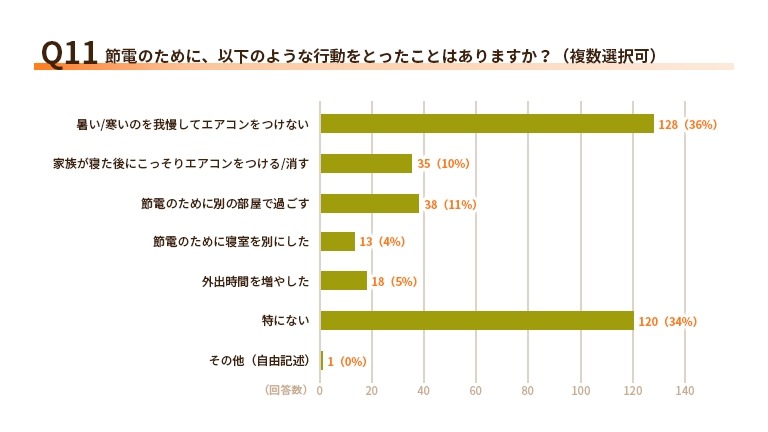 自由記述では、服装で調整、エアコンをなるべく使わない、同室を避ける、オール電化の安い時間帯に家事を行う、話し合いで妥協点を決める、諦めるといった工夫が挙がりました。