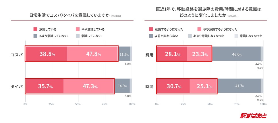 ヴァル研究所は、同社が提供する経路検索サービス「駅すぱあと」の「駅すぱあとアプリ」ユーザーを対象に実施した、移動における費用対効果(コスパ)と時間効率(タイパ)の意識調査結果を公表しました。