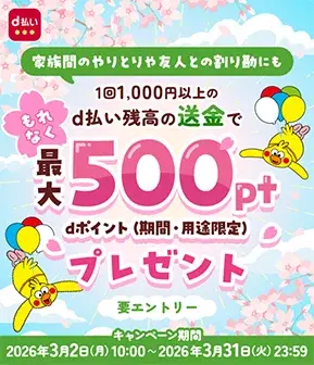 別途エントリーの上、期間中にd払い残高を用いて1回あたり1,000円以上を送金した場合、「d払い残高の送金で最大500ポイントプレゼントキャンペーン」の対象となります。