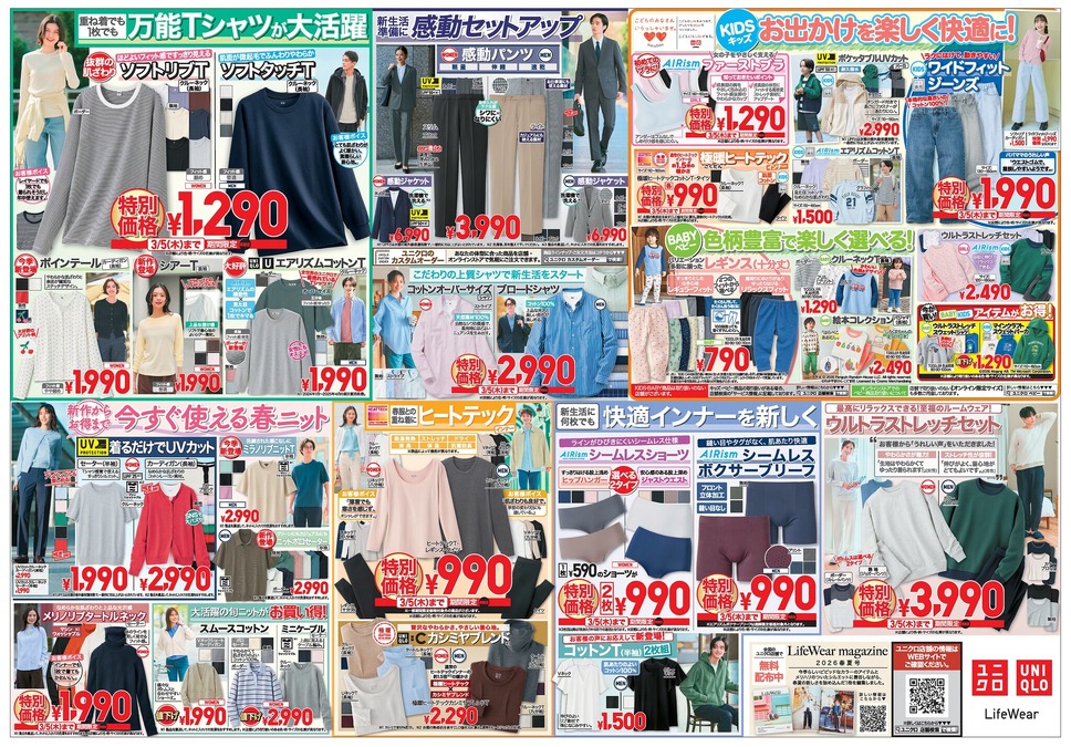 今週のユニクロは、新生活準備や春服の買い足しにちょうどいい特別価格商品がそろっています。表面ではバギーカーブジーンズや春アウター、裏面ではソフトリブTやヒートテックインナー、さらにKIDSアイテムやルームウェアまで幅広く値下げされているのが印象的です。