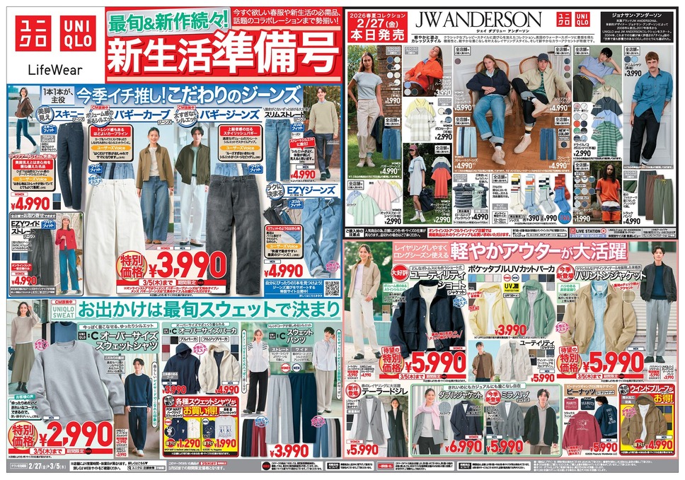 ユニクロでは、2026年2月27日(金)から3月5日(木)までの期間、春の新生活準備に役立つアイテムが特別価格で登場しています。今週は、今すぐ着られるスウェットやTシャツに加え、アウター、ジーンズ、インナーまで幅広く値下げされているのが特徴です。