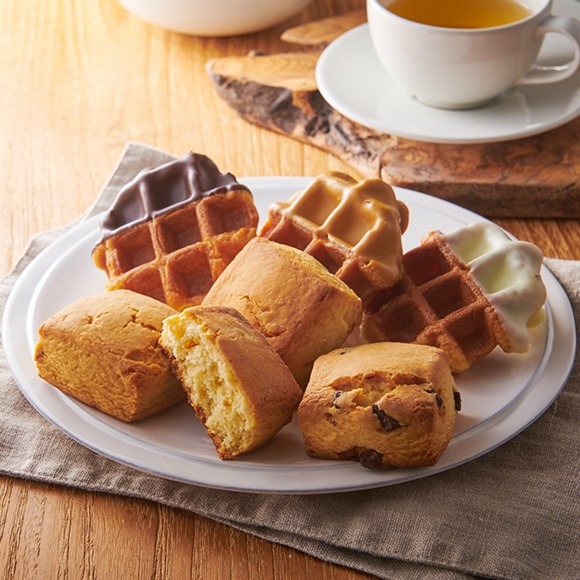 ワッフルとスコーンの両方を楽しめる、満足感のある詰合せです。ビスキュイワッフルは、こんがり焼き上げた生地にチョコのアクセントを添えた仕立てで、やさしい甘さとコクのある味わいが魅力。