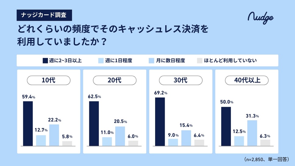 ナッジは、同社が運営する次世代クレジットカード「Nudge(ナッジカード)」の会員2,850名(18歳以上)を対象に、キャッシュレス決済の利用実態調査を実施しました。