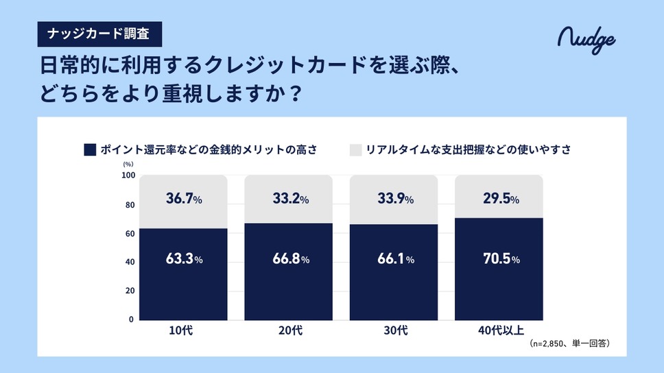 カード選択ではポイント還元重視が多数ですが、約3人に1人はリアルタイムな支出把握を優先し、10代は36.7%、40代以上は29.5%でした。