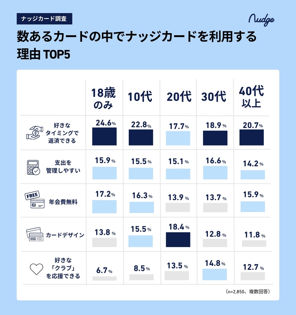 ナッジカードを選ぶ理由は「好きなタイミングで返済でき、すぐに利用枠が戻る」が20.4%で最多、18歳では24.6%でした。20代はカードデザイン重視18.4%、30代14.8%・40代以上12.7%は「好きなクラブを応援」を評価しました。