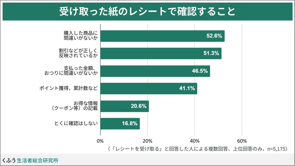 受け取り後は「購入した商品に間違いがないか」52.6%、「割引などが正しく反映されているか」51.3%、「支払った金額・おつりに間違いがないか」46.5%を確認しています。