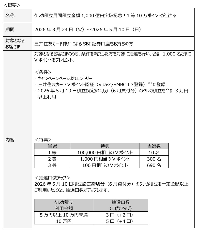 三井住友カードとSBI証券は、共同で提供する「三井住友カード つみたて投資(クレカ積立)」の月間積立金額が2026年3月に1,000億円を突破したと発表しました。