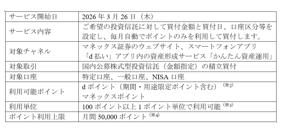 マネックス証券は、2026年3月26日(木)より、ポイントを利用した投資信託の積立サービスの提供を開始したと発表しました。