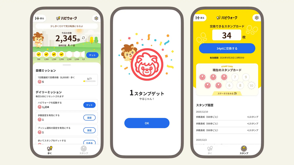 アプリ内では、公式キャラクター「はぴおん」がユーザーの歩数に応じて画面上を歩き、応援コメントが表示されます。